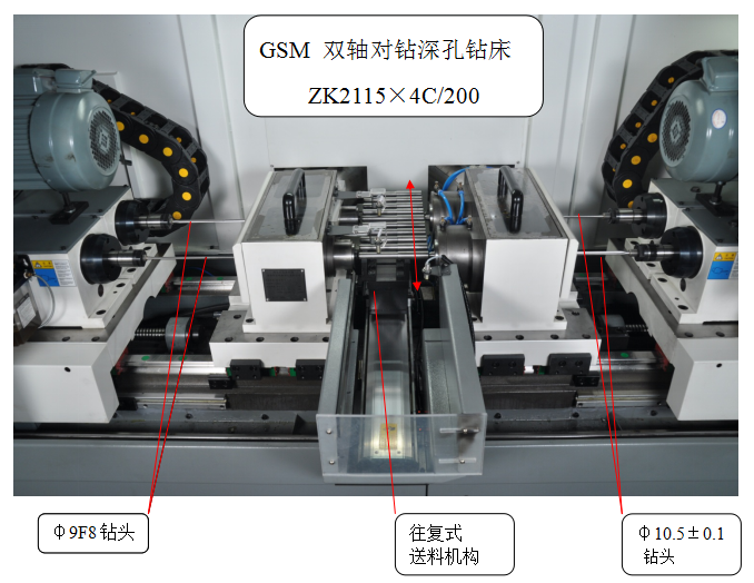 1. 机床结构的选择:因为φ9f8 (+0.013-0.035)孔径公差要求非常高,又加之零件为大批量生产,效率要求极高,所以深孔加工过程需要稳定可靠,并且要方便刀具及工装的调整。所以,机床的主轴数量选择为2轴。如果选用4轴机床,则同时调整4支高精度的刀具,难度很大,也很难保证加工质量。为了提高加工效率,考虑将左侧的φ10.5±0.1深孔与φ9f8 (+0.013-0.035)同时加工。这样可以保证工件一次装夹,完成左右两侧孔的加工,大大提高了加工效率,加工效率比通常的四轴机床还要高很多。所以机床选择为双轴对钻深孔钻床。加工孔径范围:φ3~φ15。机床结构参见下图。